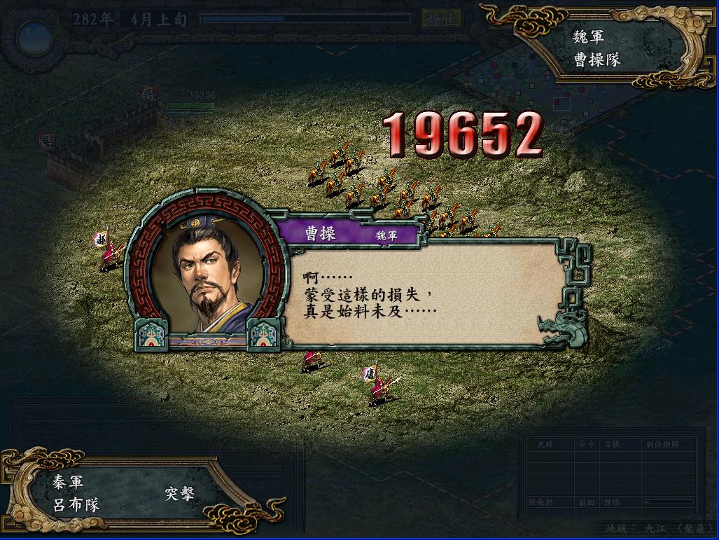 守住了敌军的攻势后,公孙度突然在柴桑反叛,于是派张辽劝降之(奇怪,政治103的张昭都劝降不了),然后下邳,小沛各出两支飞射队,两支箕型两支锥形,每支五千轮番攻击,很快打下了寿春;湖阳港和上庸乘新野出兵偷袭长安,派遣高机动力的锥形飞射队出击攻打新野,敌军猝不及防,新野被偶轻易攻下,敌军的井阑由于长期在外,士气低落,被偶很快用突击队全灭;随后吕布等人调回寿春,出兵攻打庐江,敌军出城迎敌,城内3W人马只能让一个超低忠诚的垃圾带着,被偶登用之后,城外敌军就只能等死了。同时刘封攻打襄阳,曹军难以抵挡,于是只能逃到会稽,江夏坚守。