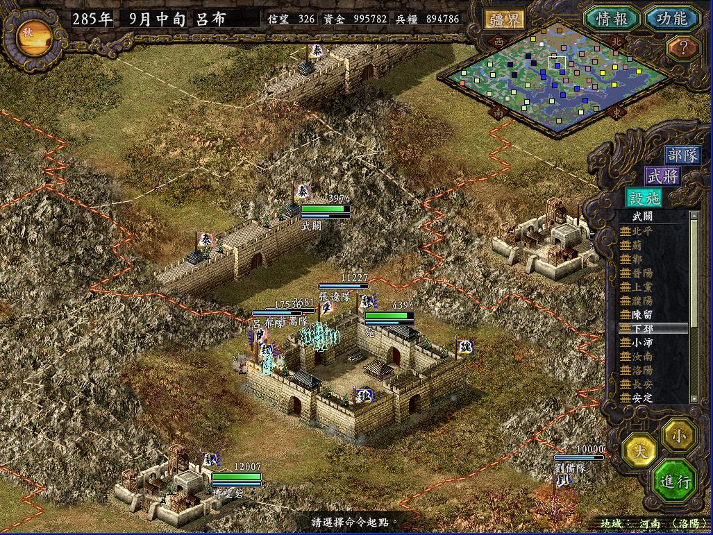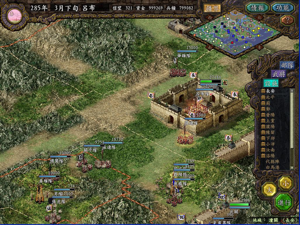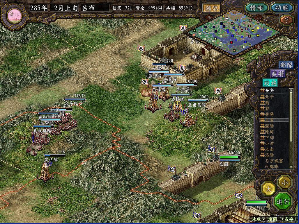 挡住了曹军的进攻后,秦军将安定的10W新兵全部运往长安,宛城;将上党的86K中的7W,晋阳的4W全部运往蓟和北平。这时发生了一件非常好笑的事情,襄平袁绍在柳城建阵想攻击偶的北平,而乌丸也出兵2W来攻打北平,结果半路上两家自己打起来了,死伤惨重。这时袁绍再次从平原出兵攻打濮阳,被偶轻松剿灭。袁绍从平原的进攻很麻烦,通常都要抽调很多人去迎敌,于是派魏续等人率3W兵马占领高唐港,这样袁绍就无法再骚扰濮阳了。曹军的许昌4面被我军包围,于是派遣吕布领35000兵马去攻打。这次攻城非常的失策,我没想到曹军居然出了三个文官陷阱团出来打我,以致中了3次陷阱,不过幸亏抢在敌军援军进城前攻下了许昌(其实敌军一共5w,出来3W5K,里面的1W5K被偶4个飞射解决,出来的文官团还没来得及进去,HOHO)。而南皮经常出兵攻打北平,于是派严政这个超级废柴带了3000兵马诱敌,把南皮主力引出城外,一直引到蓟附近,然后北平飞射队,蓟突击队同时出击,南皮只有1W人在防守,被偶轻松攻下。出城的敌军居然是锋矢阵,防守巨差,被偶几个突击全歼。由于俘虏到了夏侯惇等几个强人,于是把严政张勋张卫郑冲给流放了。