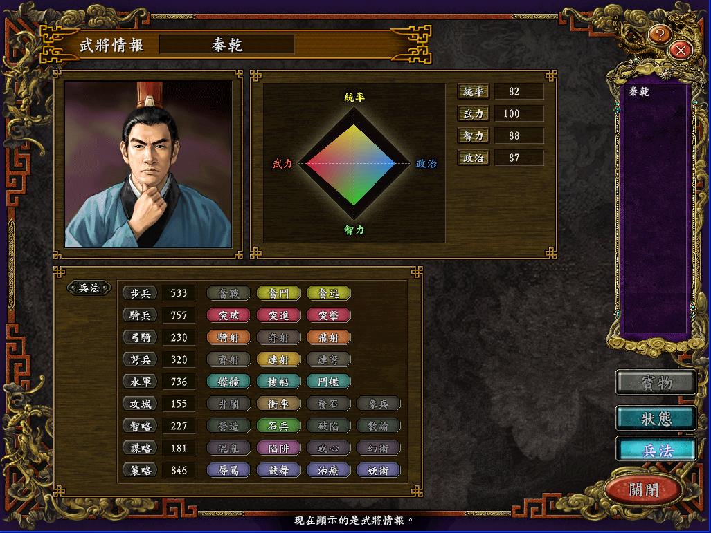 3旬内,张勋,甘丽,高顺,吕布各发动一次单挑并获胜,突击发动7次,突进发动4次,突破发动3次,陷阱发动一次,奋战发动1次,刘焉军全灭,提拔一个名叫秦乾的小兵。