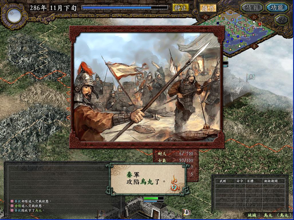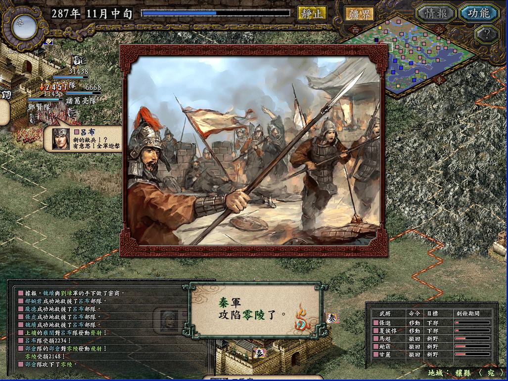 正当偶忙着征兵的时候,马腾和刘焉已经打的不可开交了。先是马腾带了4W人去打阳平关,结果被刘焉打了回去,刘焉顺势将屯了21W兵的汉中人马倾巢出动(留了4W),去攻打马腾8W人的天水,结果自然是马腾败北,而此时天水耐久只有100多,于是,我又用对付乌丸的方法对付刘焉,被偶白赚7W的生力军。为了南征,西北的马腾和羌军是必须清除的后患。于是吕布,张虎各领一军攻打西平。而武威的援军立刻出动,武威空虚,无奈安定离武威差不多1个半月的路还是让偶打消了奇袭的念头。而西平城下,两军陷入了苦战,马家军的突击,秦军的飞射都威力无穷,张虎队兵少,一番恶战后只剩4K人了。此时偶突然心生一计:令张虎奇袭武威,若西平不增援,则武威可得;若西平增援,则西平可得。于是西平到手。要问秦军如何取下武威,且听下回分解