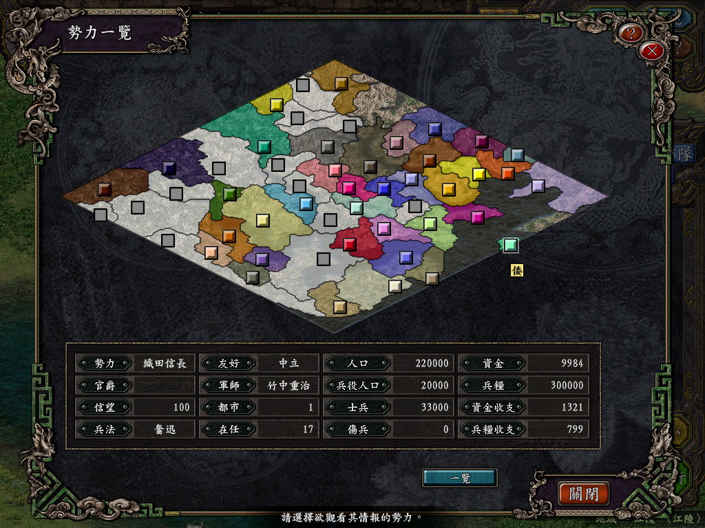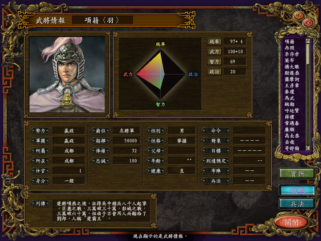 简单说下这个剧本,就是新建立了100个新武将,还有把一些不常用的人换成了一些日本战国武将,加如了甄女王,除日本武将外全部补完列传,新假如若干宝物,比如赵云的龙胆枪,把一些不常用的宝物图片换了。电脑可以攻打异民族,异民族也能占领城池了,更改了异民族武将的名字和头像,做到了一人一名字头像,列传没法改,光荣把4个相同名字的异民族武将都用的同一个列传文件。 新加如秦势力,君主赢正,武将88个中国古代武将。用孟获取代原南蛮势力。新假如函谷关,改了些地名。具体看图。花了我很多心思。