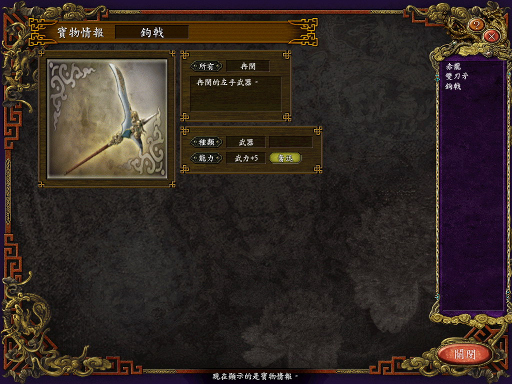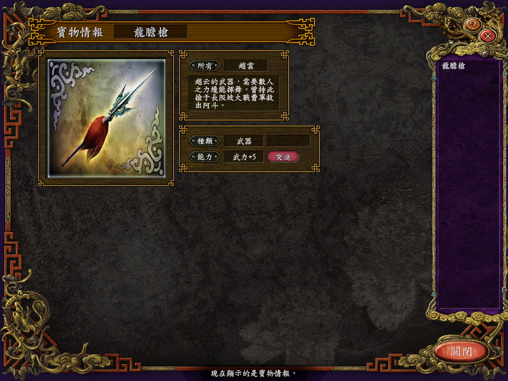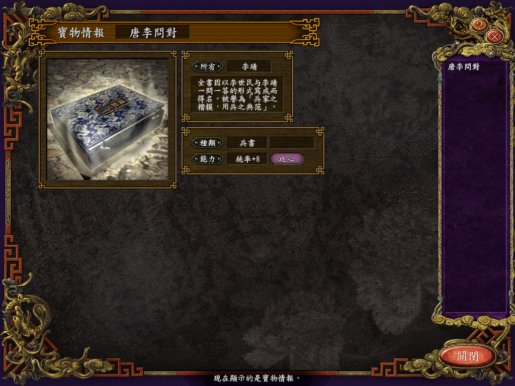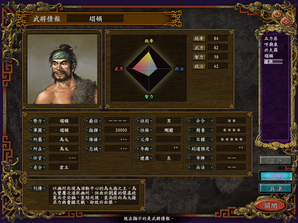 使用:下在全部文件解压缩,D_Titem.s9是宝物文件,放在My Documents\Koei\San9 TC\TItem下,D_TPrsn.S9是新武将文件,放在My Documents\Koei\San9 TC\TPrsn下,D_Sav035.S9是原始存档文件,放在My Documents\Koei\San9 TC\Savedata下,默认是第34个存档位置。其他的文件就放在游戏安装目录下。由于我不知道宝物图片是那个文件,所以可能一些新宝物的图片会有偏差,希望知道的朋友可以告诉我,我好把它传上来。