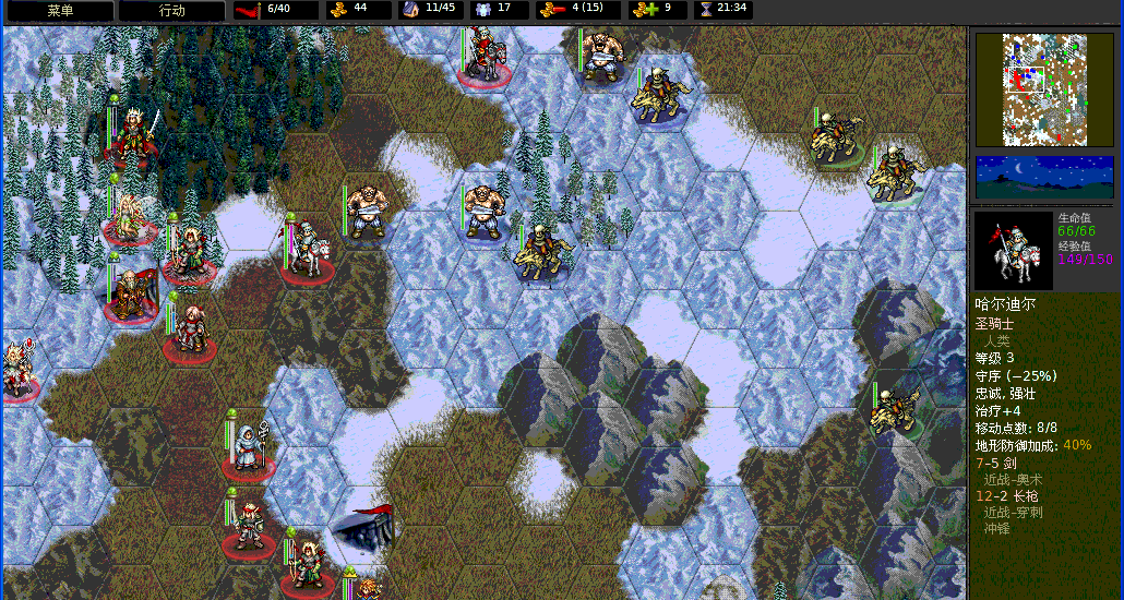 高阶骑士是HP最高、单次攻击杀伤力最大的兵种,两种攻击分别是:12×4的剑刃和17×2的穿刺(带冲锋特性)。看看这个数据就知道高阶骑士是多么的强悍。移动力7。