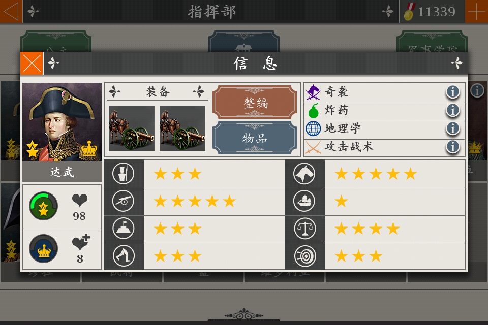 工程学:五星炮兵的皇帝是告诉玩家历史上的拿破仑用炮如神。虽然其炮兵伤害不如莫罗,但工程学的移动能力配上围城术以其五星炮兵,皇帝用炮兵还是非常合格的。