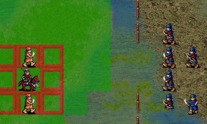 下图,当我军进攻到一定程度,打通吕布通往弓兵的道路时,吕布就会朝着弓兵移动,选择移动力消耗最少的一条路线,按照上右下左的顺序走到图中的白框位置。