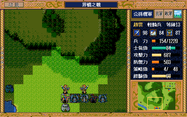 敵 步兵2上1,張郃原地牽制劉(成功->士氣60),運輸隊左上援助張郃(兵力滿)