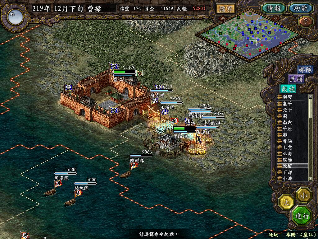 进行面:第二天曹彰就夺取寻阳,吴国各部除孙策由西门杀出,6W2皆呆于城内.夏侯霸部一马当先,发动连锁奔射,公谨损失1300人,剩余300兵马仓皇南逃,郭淮轻骑终于赶上,王双于阵中冲出,当下擒住公谨,三尖刀一闪,公谨重伤落马,徐盛见状,回马来救,拖回主帅,吴兵围上,策见状,大呼:公谨无恙呼!一个奋迅,杀的左翼的王睿人仰马翻.公谨只剩半口气,呻吟曰:既生瑜,何生双!夏侯部的夏侯惠见兄立大功,不甘示弱,文有文用,一个混乱定主公谨,吼道:复呻吟乎?自此瑜部全灭,徐盛为救公谨被俘.策的5000步兵也杀的只剩300人.