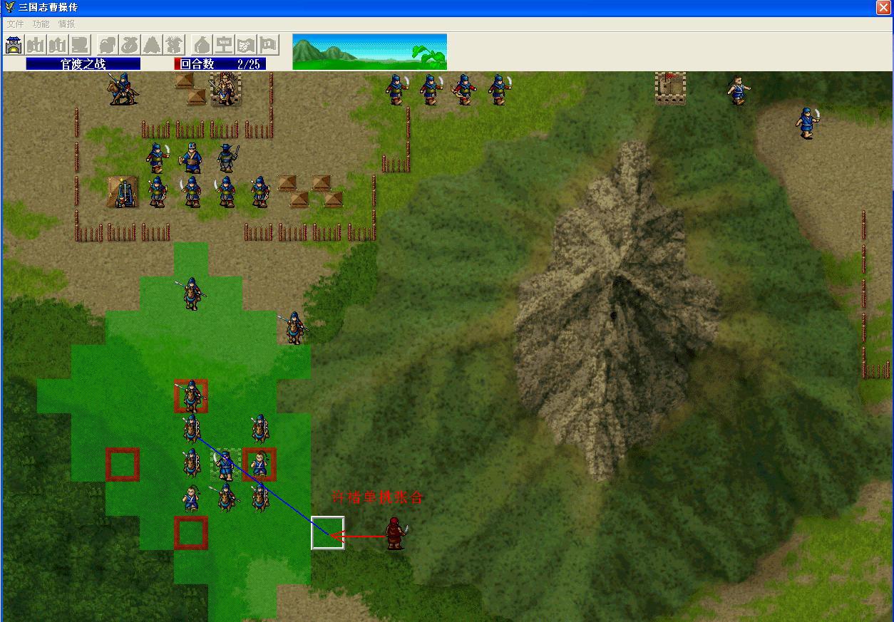 这关只要击退袁绍即可,所以先设计让袁绍的后方空虚,再用人牵制住他的前军,而后绕到他的后方,击退他。战斗开始,选择斩杀许攸,这样他会跑回去报信,袁绍的会派袁尚率领后方的一些人去支援粮仓,这样第一个目的就达到了,袁绍后方空虚。而后,我军全力牵制袁绍的前军,用许褚单挑掉张合(这里是剧情撤退,没有经验),站位如图,敌人打不到许褚,而且能把张合吸引过来