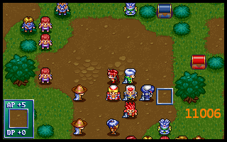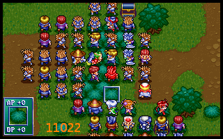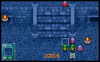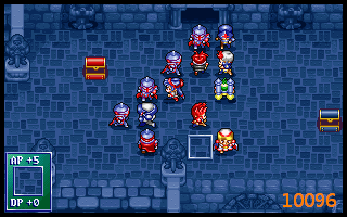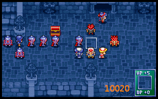 上边魔导耗光及亚克魔补后,闲人捡右边箱子和门口左边暗箱(力量药水),盖亚继续清敌(早先怕不够杀,布兰多往上送,结果有富余,裘娜清掉)。19回合我方站位及高级援军出现后形成下图10020,其中盖亚上一为低级骑兵。