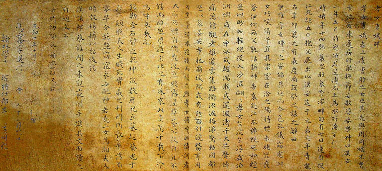 后来,大书法家蔡邕闻讯也来看望曹娥碑,时值暮夜,黑灯瞎火,蔡邕看不见,就用手抚摸碑文,细细品读。读罢深为感叹,遂题八字于碑阴,曰:“黄绢幼妇外孙齑臼。”此八字无人能看出其奥妙之处,直到三国时期,曹操与杨修路过曹娥碑,才解出了这八个字的真意。