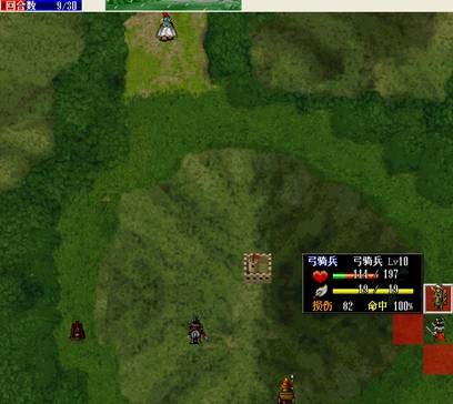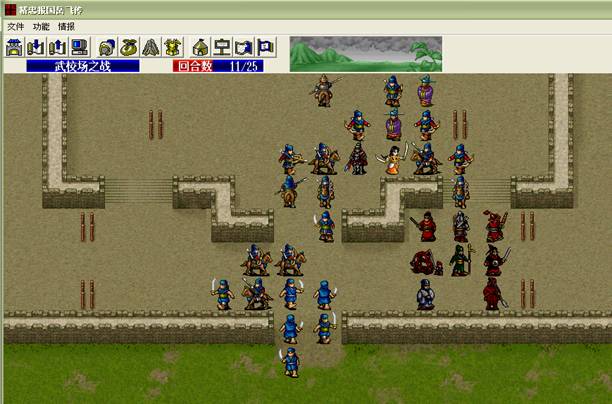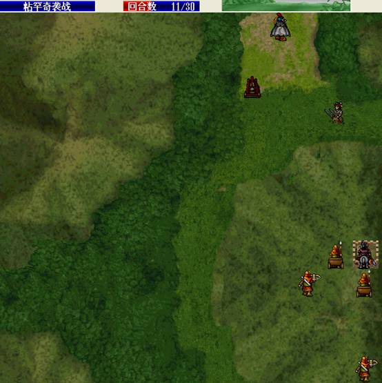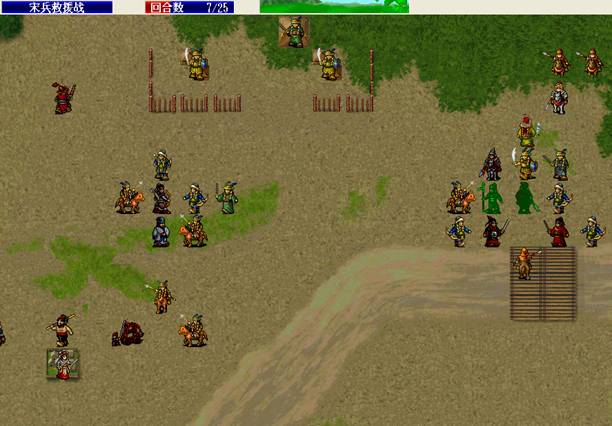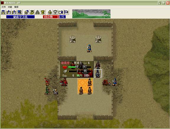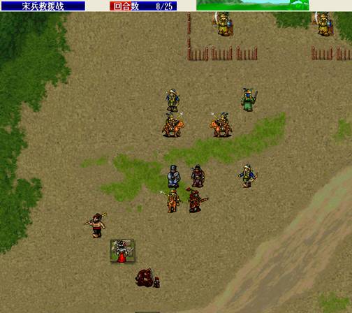 下回合,汤怀触发乌国龙出击.王佐毒死骑兵,张显打道士,施全给王贵补血.(PS:王贵不要打死步兵,打至濒死即可!这样杨BT会走到吹死他!而不是去攻击文官)下回合変成这样.(12)