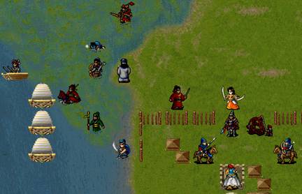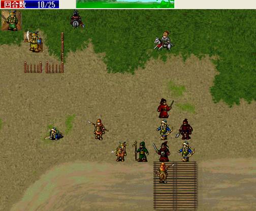 下回合:如果RP好的话,梁红玉物理全档,王横中毒扣血,物理全档,吉汤前进后,诸葛牛鼻子给三人褔星,牛走到桥头,王佐降折彦质上面骑兵的防,由折暴击击退.岳飞给折部褔星,施全给我军四人褔星.友军回合王横双击骑兵,会由侍女击退,由于王横会走出道士放毒范围,侍女顶上,所以道士会向侍女万蛊缠身,而造成侍女的低血.注意不要拿药,要让低血岳帅去吸引敌人(不用管YYP的打法真爽!). (7)