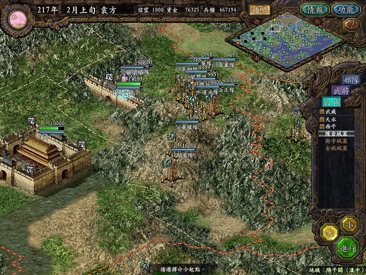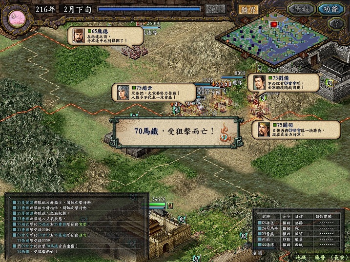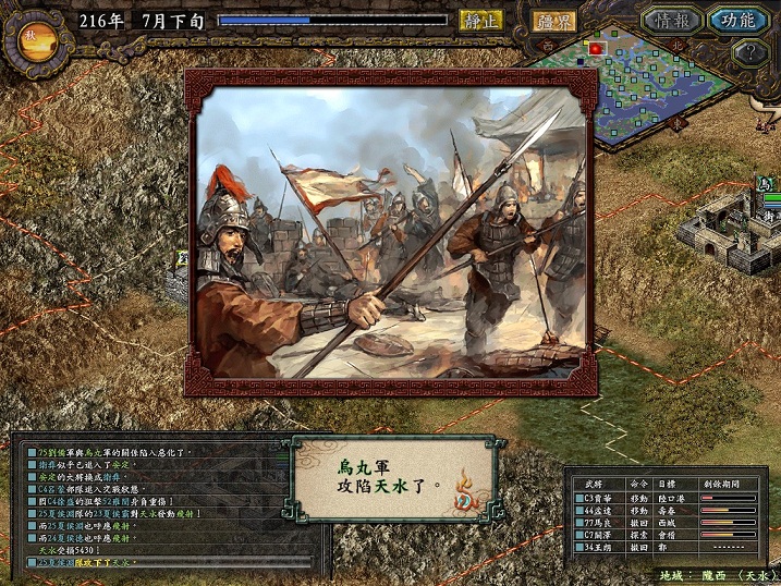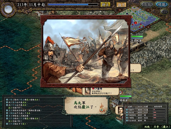 动辄一个长蛇过来,我还没来得及反应就把孟津攻克。但随即洛阳守将吕蒙徐盛等人组混乱弩兵队出击,又把电脑围在港口里打,这一次徐盛狙击,廖化毙命。随后我撤军,电脑再占,再围港。往复几次,刘备军损兵折将,什么关平刘封等辈在这里被擒了无数次。只是因为我也不愿守港口,只得一次次把他们都放了,赚点信望了事。这里也看出AI是死的,人脑是活的,只要想玩弄电脑总是有办法。