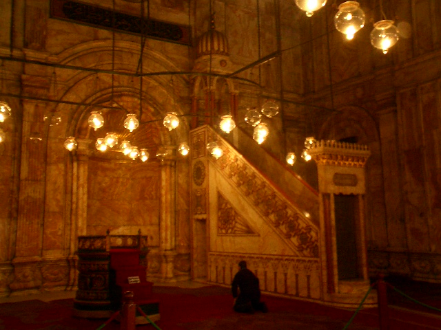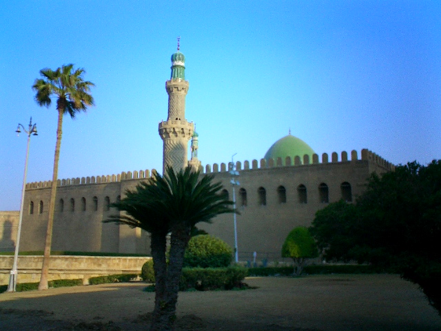 开罗另一座著名清真寺 -- 侯赛因清真寺的夜景。傍晚坐在侯赛因清真寺旁的咖啡馆门前,抽着水烟,喝着黑黑的埃及咖啡,看着汗•哈里里市场上商人和买主大声的讨价还价,听着从喧嚣鼎沸的嘈杂声中传出的阿拉伯音乐,真仿佛置身于一千零一夜的童话故事里。