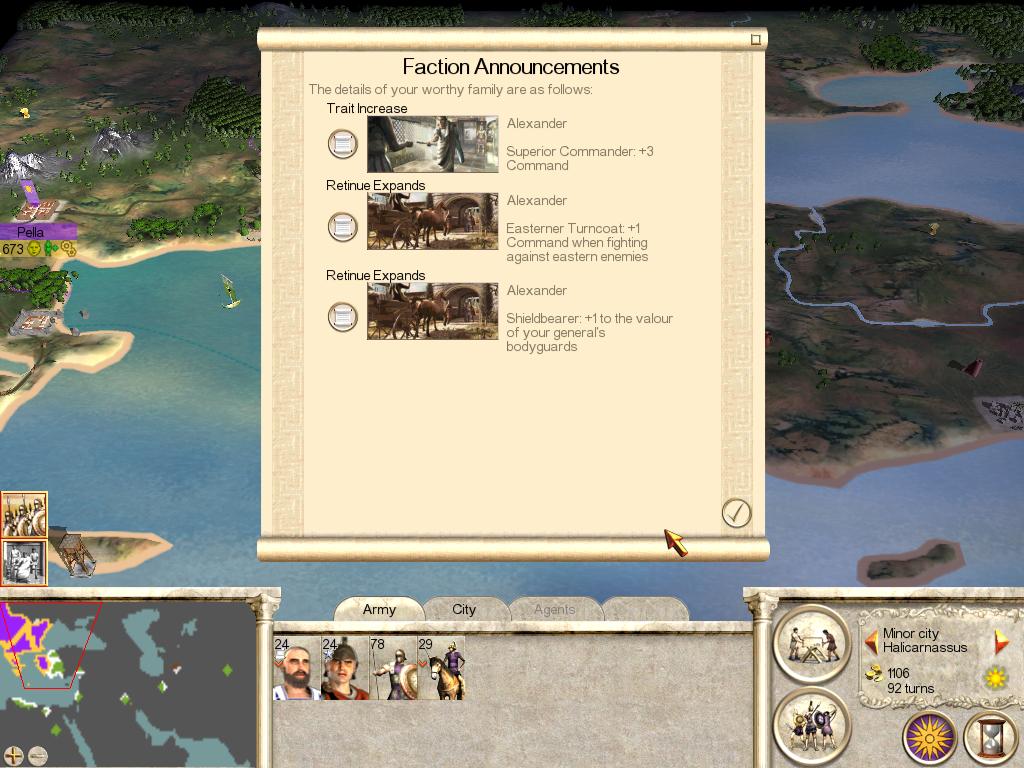因为亚历山大也凭借如此完全的胜利,赢得了特性「卓越的指挥官(统帅加3)」,同时获得了扈从「东方叛徒(与东方敌人交战时统帅加1)」和「持盾护卫(将军卫队勇猛加1)」