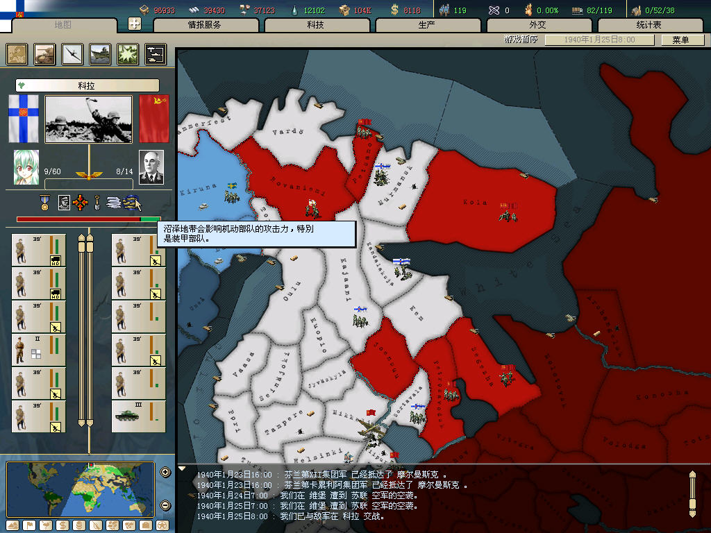 真正麻烦的是空军.我的应对策略是在维堡留2个师挖战壕.其他的部队都3个以上一起行动.飞机就优先炸人少的去了.
