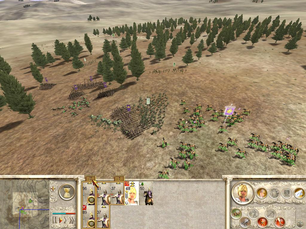 于是我军将3队重装步兵的位置尽量向左移动,以应对敌军骑兵从侧翼的攻击,而阵线上出现的缺口由二线的色雷斯雇佣标枪兵填补,这支部队与步兵交战会有较大的优势,同时我军还有1队轻骑兵随时支援