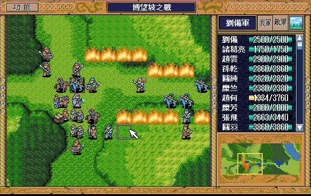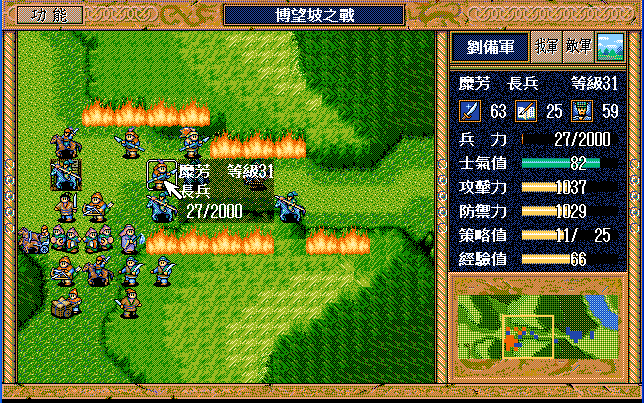 15回合后大家从夏侯惇身上揩油,22回合敌军就位后孔明开始放火,刘封根据情况吃人。赵云先绕到右边,张飞简雍策略补充好后依次过去,赵云再回来继续补策略,这关策略相当充足,3个军乐队,刘备都补了不少。赵何本来还能多反击一次的,但是升级了反倒亏4点,因此没反击。