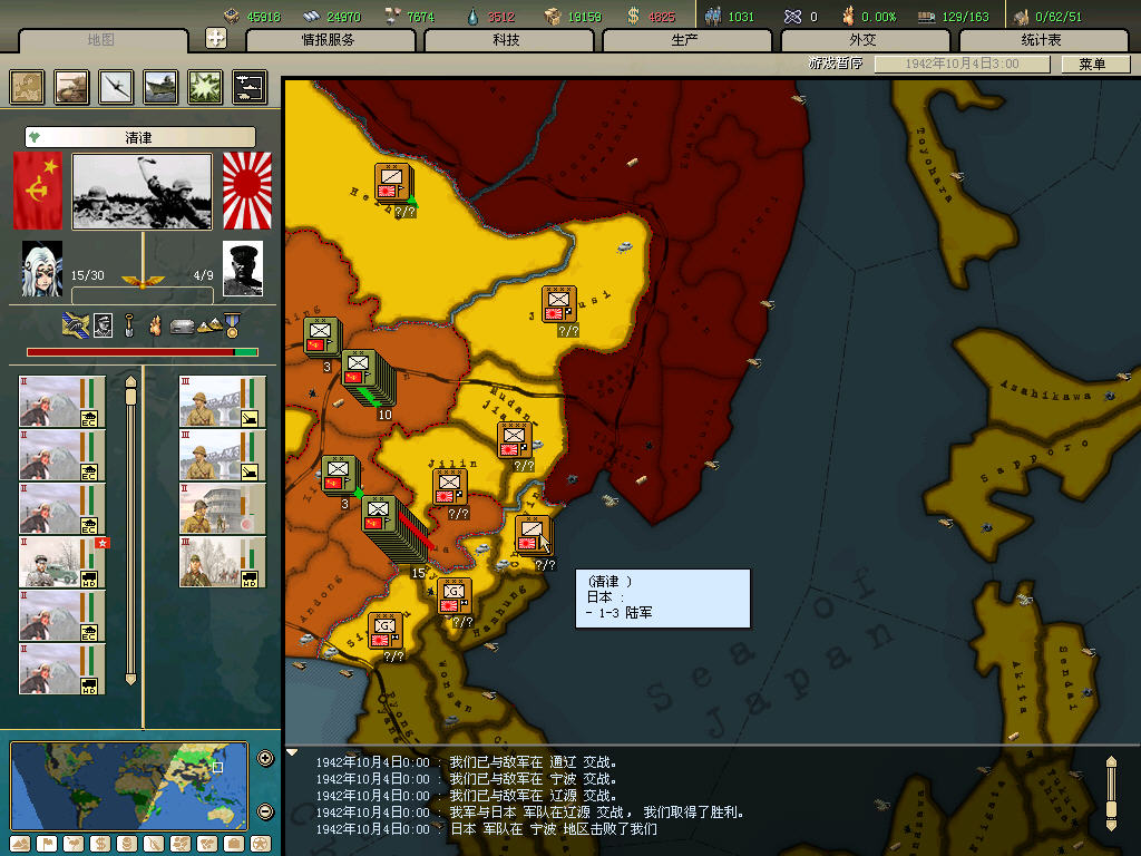 内政方面拉三条41标准步兵,一条补给船,一条运兵船流水,然后在新京 奉天 哈尔冰三地盖厂,再有余力就加上北平和天津