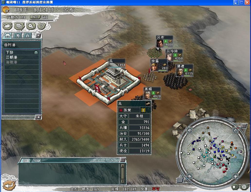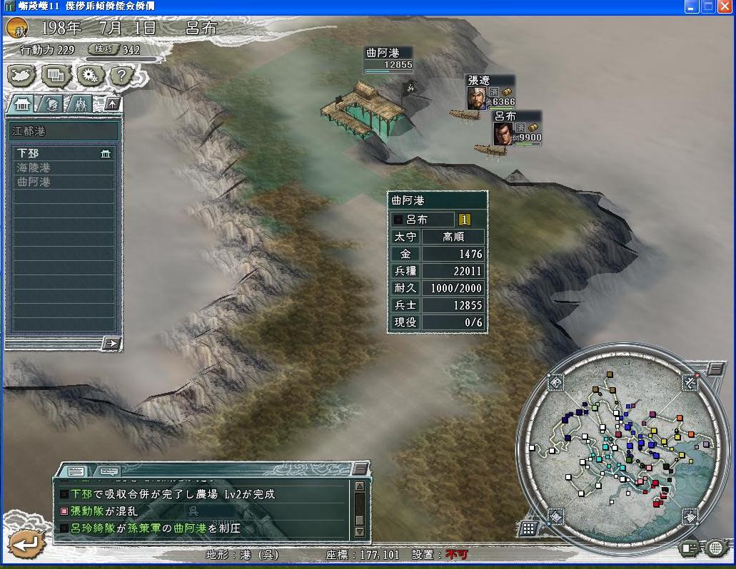 到我军物资抵达江都港,已过了整整3个月。吕布率主力将领也同时到达[下邳到江都港只需10日],立刻全员剑兵分4队对长江对面,4000人的无人空港曲阿港进军。每队带100日粮足够,留魏续运送其余物资随其后。这里我冒了点险,为了在下邳收取更多金钱,没有派水军A的鲁肃随军,导致4队人仅水军B的貂禅一队可用火箭,所以把她配给了兵最多武力最高的吕布。到198年7月1日,才攻陷曲阿港。此时曹军已攻落空城小沛,且已从陈留濮阳出兵继续攻下邳。这之前袁绍亦派高览7000人试图远袭小沛,一度抵达下邳附近。但我军有大智勇,直接无视他,果不出所料,待曹军一落城,这队袁军就折了回去。