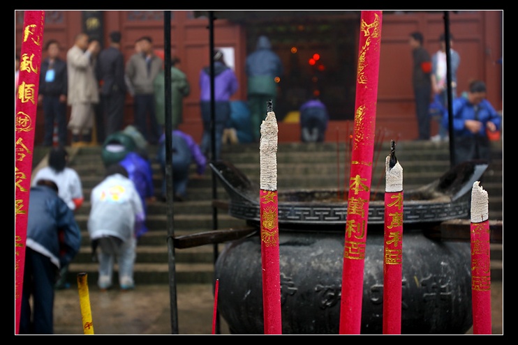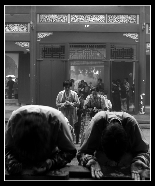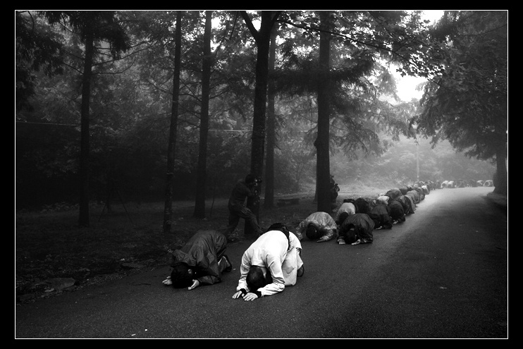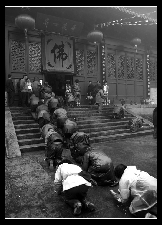 芒种日下雨,摄于天台高明寺。这些虔诚的善学道友就这样冒雨一跪一拜地上山,悲心无上,见之深深地触动了。