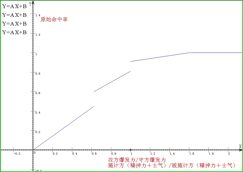 设x为攻方攻击力,y为守方防御力,lv为攻方等级,A为兵种的相生相克因子(例如弓兵对骑兵的1.5倍伤害),B为武器的附加值(例如柳叶甲的减轻远距损伤等),z为主动攻击时的理论物理伤害值