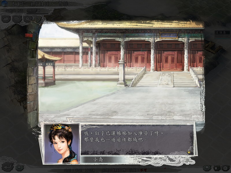 5. 曹丕到达梓潼舌辩战胜左慈;曹彰再次去吴收获大乔;曹睿到达庐江收获小乔,并且额外得到cg一张;这样差不多就用了100天就完成了“将7位女性将官招为麾下”的任务