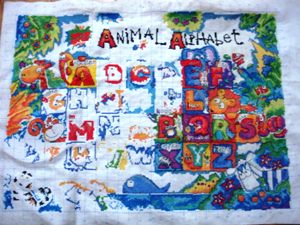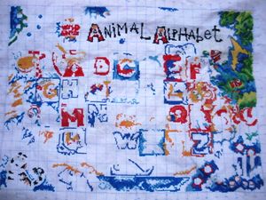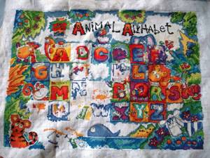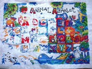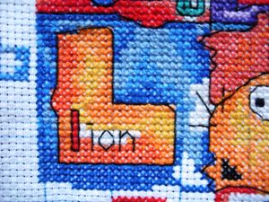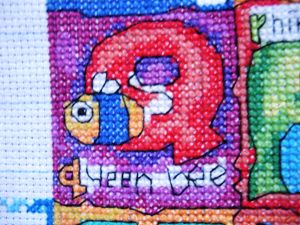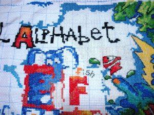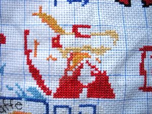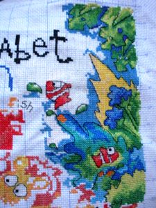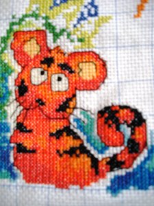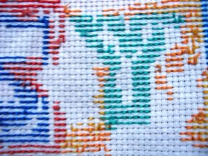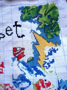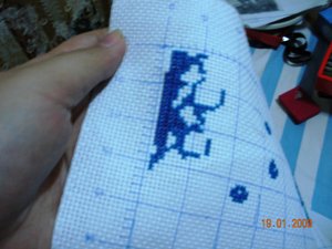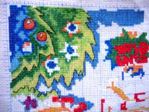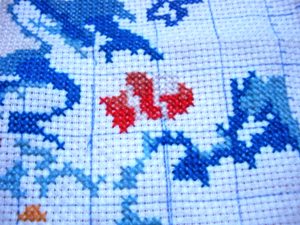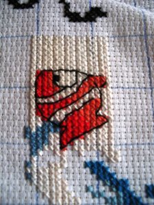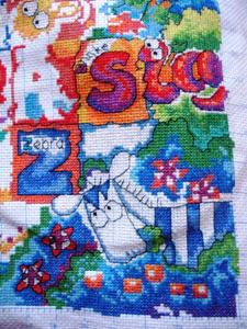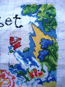 我考虑了一下觉得要是按照以前的想法,等都绣完了一起勾边,很有可能有哪部分没注意就没勾上的情况出现。所以改变了一下方针策略,决定还是从角上开始绣好了。不过其实是,左上角已经绣好一部分了,右上角几乎没怎么动,但是整个右半部分的进度要远远快于左边。所以考虑了一下还是从右上角开始好了。