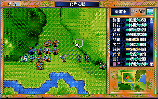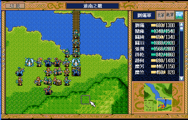 我:刘备奔向鹿砦,糜竺原地激励赵何,糜芳左上焦热书陈宫,关纯原地激励自己,赵何左方牵制武术家(失败),张飞上方牵制(失败)关羽下方牵制(失败),简雍原地援助赵何,孙乾左侧攻击骑兵