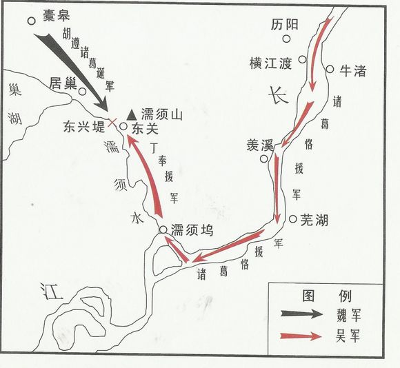 当年曹操出濡须,朱然守大坞及附近的三关屯,大坞即濡须坞,三关屯就是水经注所指的东关三城。城名虽然来自日后的石虎等人,但当时有三个关这点应该无问题,诸葛恪少复修了一城。