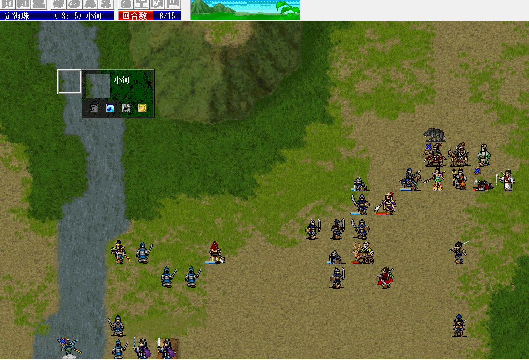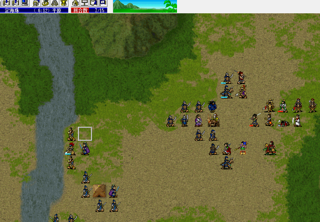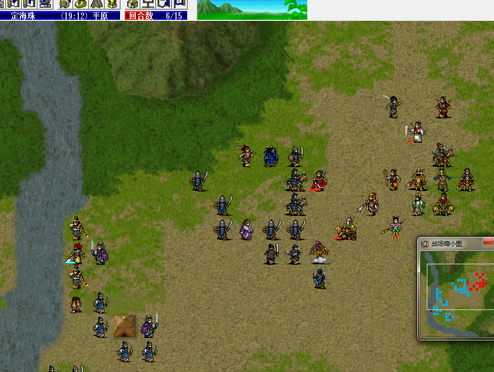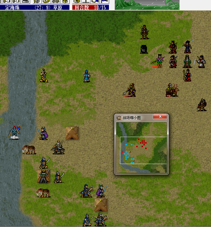 容易观察到,敌方大部分道士都在左边,因此,用雷震子飞到小河上,可以有效吸引道士的火力。而这些道士的法术命中几乎都不超过20%(雷震子75%策略防御),稍微SL一下就能全部miss。而其他的近战由于打不到雷震子只能退而求其次地去打右上方的我军大部队,于是近战和法师就脱节了。