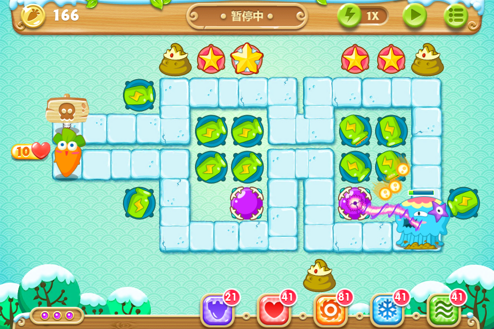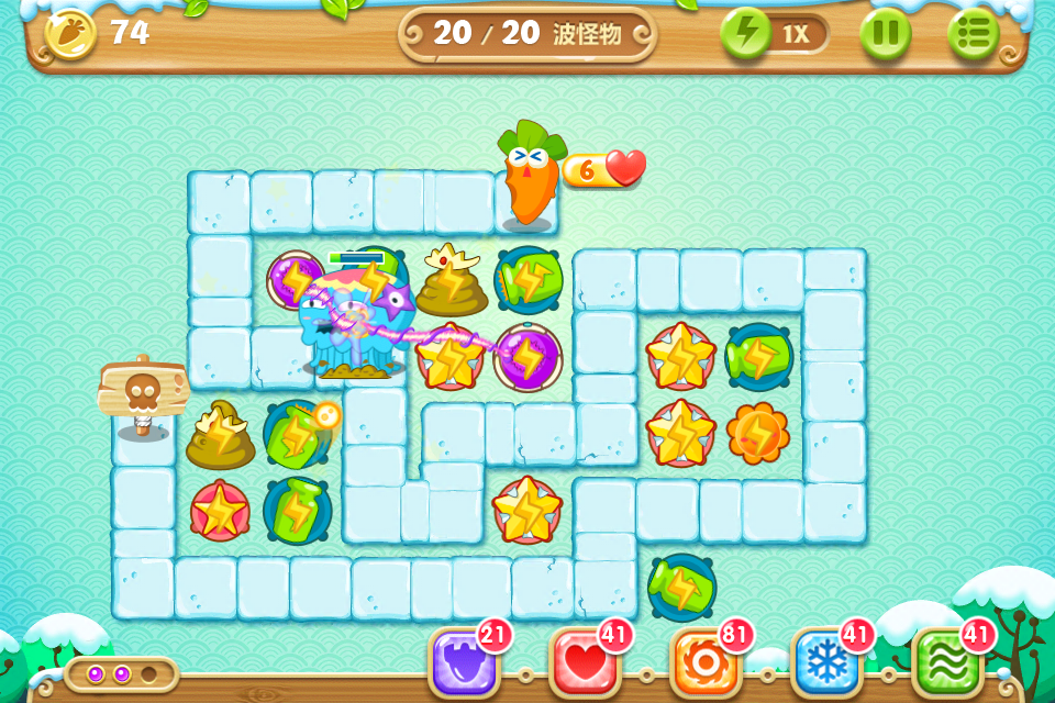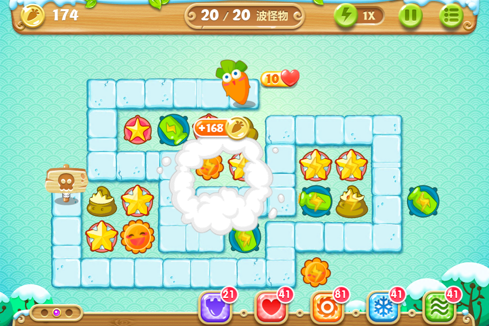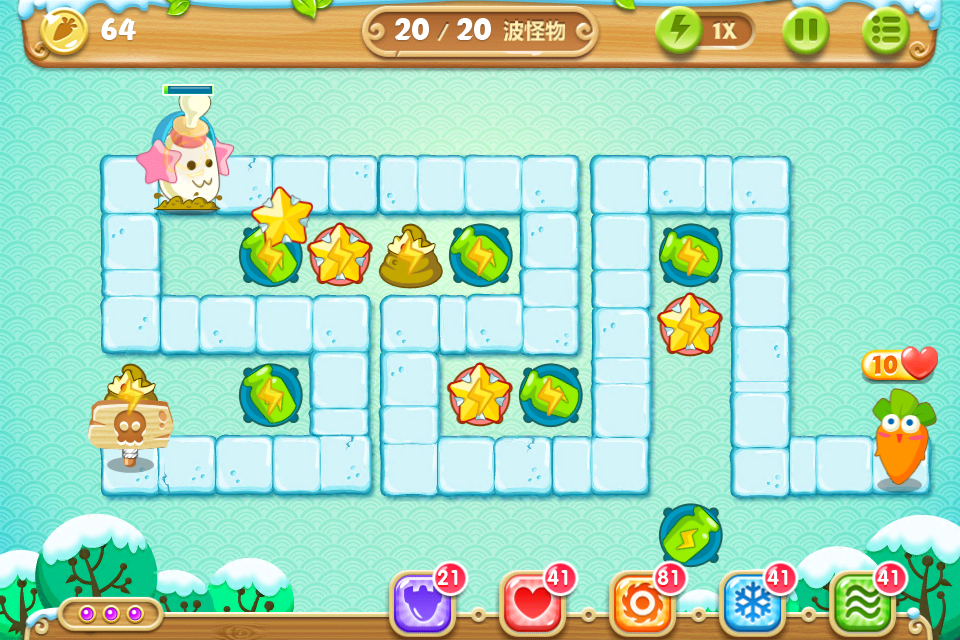 目标:不用魔法攻击,不用带技能的萝卜,全部65关收集金萝卜、水晶萝卜、全灭道具过关