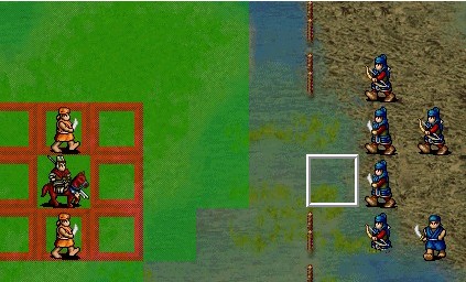 下图,当我军进攻到一定程度,打通吕布通往弓兵的道路时,吕布就会朝着弓兵移动,选择移动力消耗最少的一条路线,按照上右下左的顺序走到图中的白框位置。