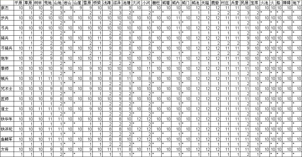 下表是岳飞传所有兵种的地形属性,也包括地形的行动损耗。由于驯虎师的山地移动消耗可能在下一个版本中改为1,本表写做2(1)。*表示不能移动。