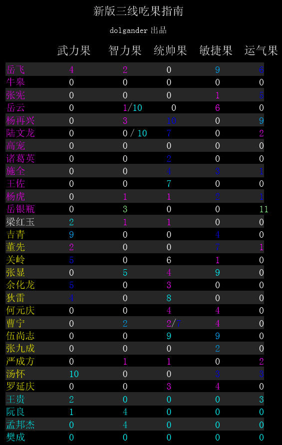 对于许多新人来说,吃果子是个头痛的事情。本人试图给个简单直观的表格,你不需要去搞清那个‘复杂’的理论,不需要知道人物的具体数据,只要按说明,选定你喜欢的人物后,按自己能力,选择性培养你的主力名单。对于有竞争性需要的人物,你要有选择性,如武力果,除岳老大必须外,吉青、余化龙和关岭全面培养难度非常大,你必须放弃其中1-2人。