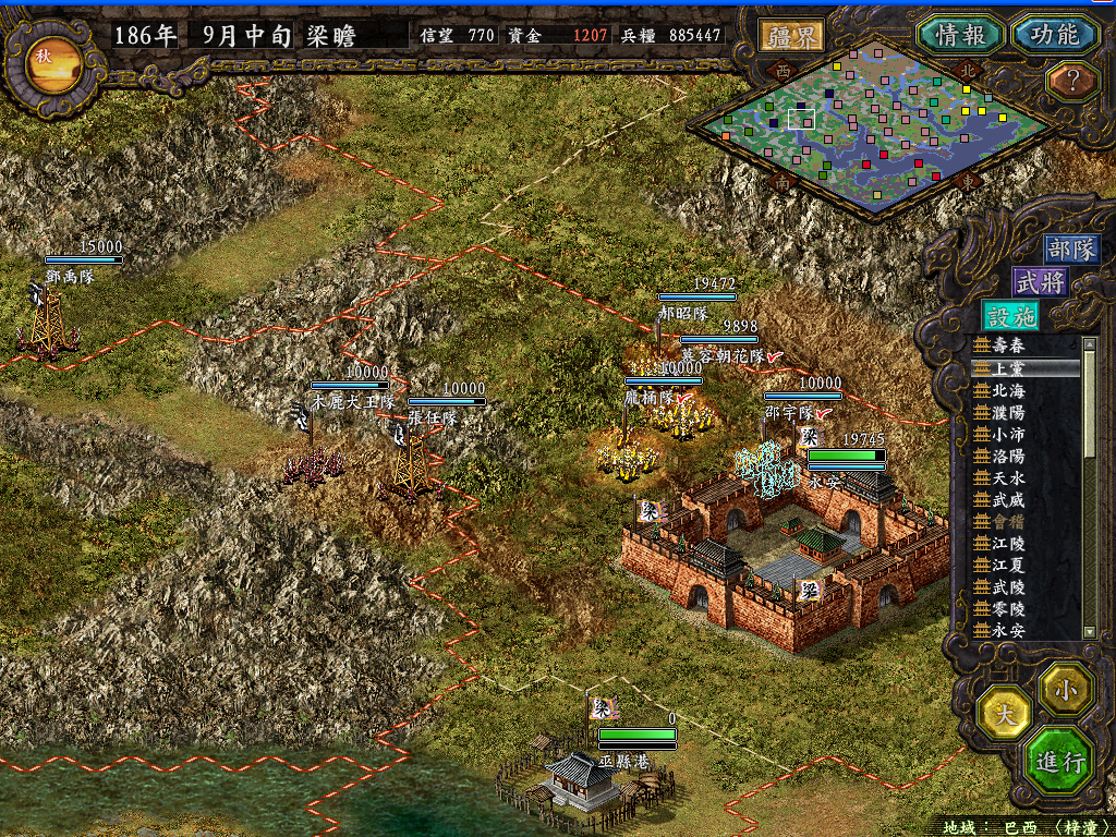 另外,汉中的防守太强了,阳平关就屯兵好几万,不是假途灭虢战术能打掉的,而只要不在短时间内打掉,汉中7W多的援兵就会源源不绝地开到,持久战强攻的代价太巨大了,我不愿轻易发动。反正我在天水的屯兵也有20多万了(尽是野战骑兵队,耗羌的),汉中的军队也被压得不敢出来,我也乐得和他对峙,先拿东边的对手开刀。