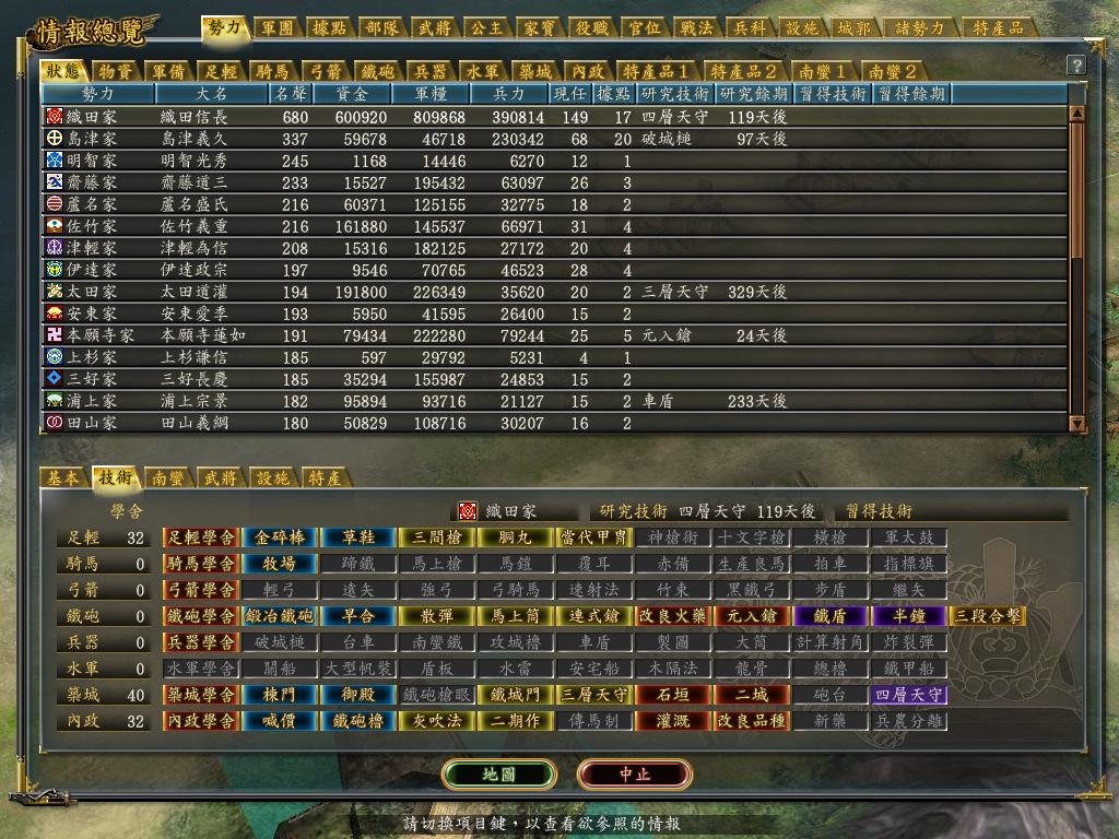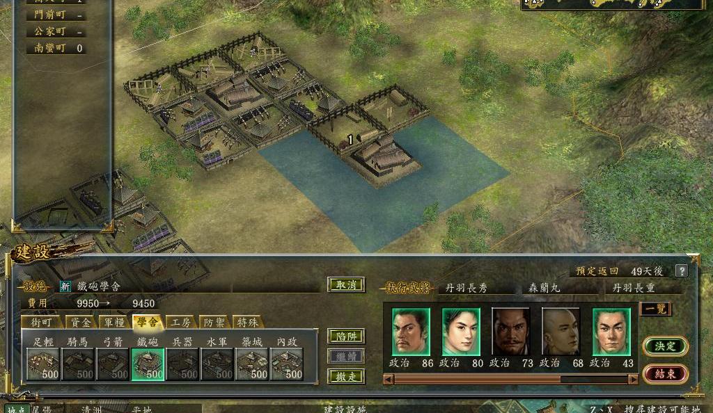 信长+兰丸+信忠三个人一起建3个町(1个商人町,1个农村,1个武家町),剩下的4个人建3个田和一个市。信长,兰丸,信忠3人回来后建几个市,前提是能保证在换季前完成。然后他3个人再去建2个职人町和1个武家町。接下来政治上40的人开足马力建铁炮学舍,其他人建市和田。市和田的建设一定要在换季前完工。垃圾们在换季前回到城里,马上流放之,就这么录用一批,每人建设一个市或田,然后又流放,免费劳动力,呵呵。