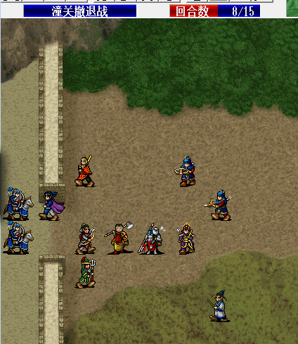 打了一整天都没过 悲剧第一次出场人物王勇 老程 老单 双刀MM 徐绩 贾润浦 谢映登 平均24级 首先夺关,第四回合伏兵出来混乱一个关内的弓骑,其他守门的利用群功全杀 然后堵关群杀 到11回合杀干净接着迎战河里过来的敌人,悲剧出现了,那有个铁骑死活不动,过了河之后一直呆在树林里,最后1回合碰不到他,