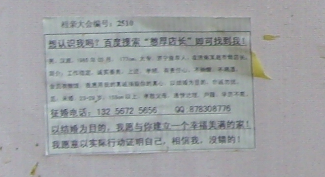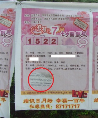 好的方面就不多说了,这次七夕相亲会要说最可气的就是千佛山公园和生活日报和移动公司之间的利益勾结了。以往相亲会信息都会刊登在生活日报上,而这次马路上卖的生活日报只刊登了少数人的征婚信息,而绝大多数征婚会员的资料则撰写在了一份生活日报相亲会专刊上面。这份专刊只在公园内出售,逼着一部分没报名的人要进门买票再买报纸,而生活日报更可气,这份专刊一份高达10元钱,这么贵不说,会员资料里还没有联系方式,还要满山上对号寻找,真气杀人也。