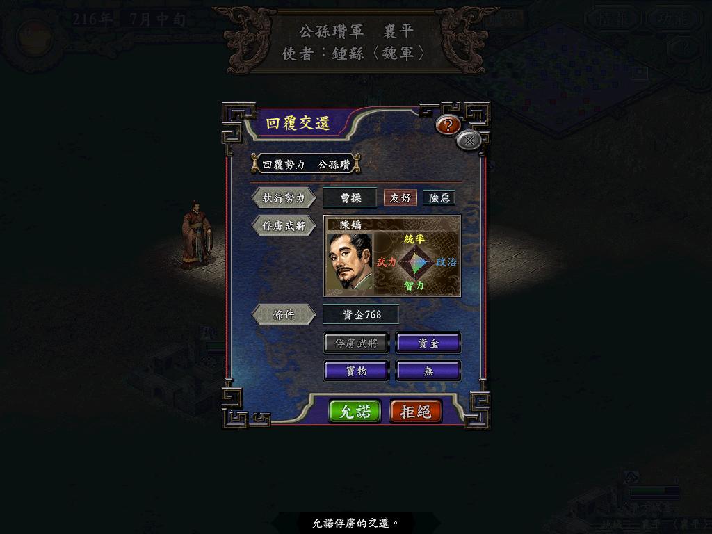 事实证明第一次还确实失败了,原因金钱不够,按照以前玩首屠剧本江陵剧本思路,压力比较大的时候送钱求和,两次送了共1w多,后来曹操又来打的时候钱不够出征的(出征费实在太高