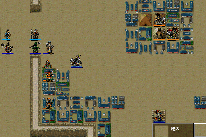 上路弓兵被郭图加过好多次血了,不要紧,实在不行后面李典出城一刀一个,给他们加血总比给步兵加血强,这关比较特殊,弓兵是能被反击的。徐晃曹洪收掉那个武术家,曹操往下走一步撑大圈子。