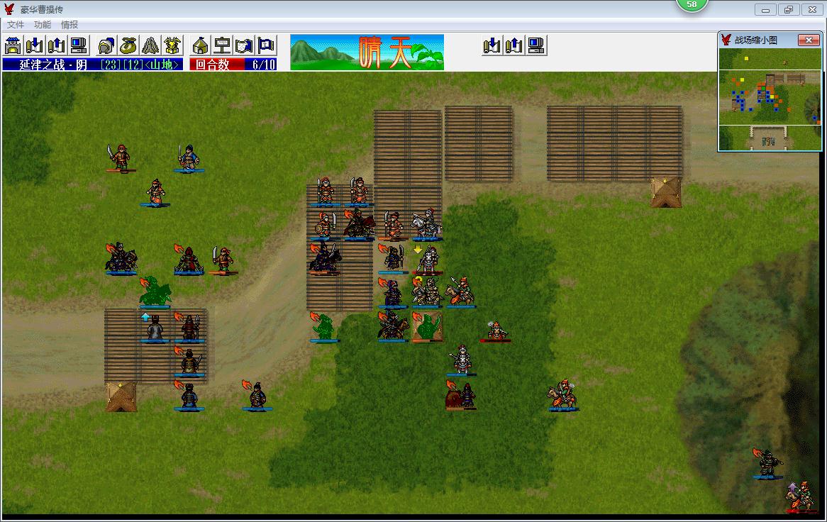 豪曹基本上所有的关卡都是我军以寡击众,面对数倍与已的敌军,很多玩家玩玩很容易陷入敌军的节奏。战争基本上都是空间的争夺,曹操传这种战棋基本也是如此,基本上我军的优势在于人员装备素质相对占优,能够在局部的空间上获得优势,我的战术理念基本是可以暂时放弃部分的空间,集中优势兵力各个击破。而这个击破比较重要的就是优先击破敌军的重要人物,一般是文官和远程部队,这些兵种一般行动顺序比较靠前,只要我们事先挖下坑,最先掉下去的就是他们。我这篇战报比较重要的地方就是通过断不的挖坑下套把敌军威胁较大的文官和远程快速坑杀。