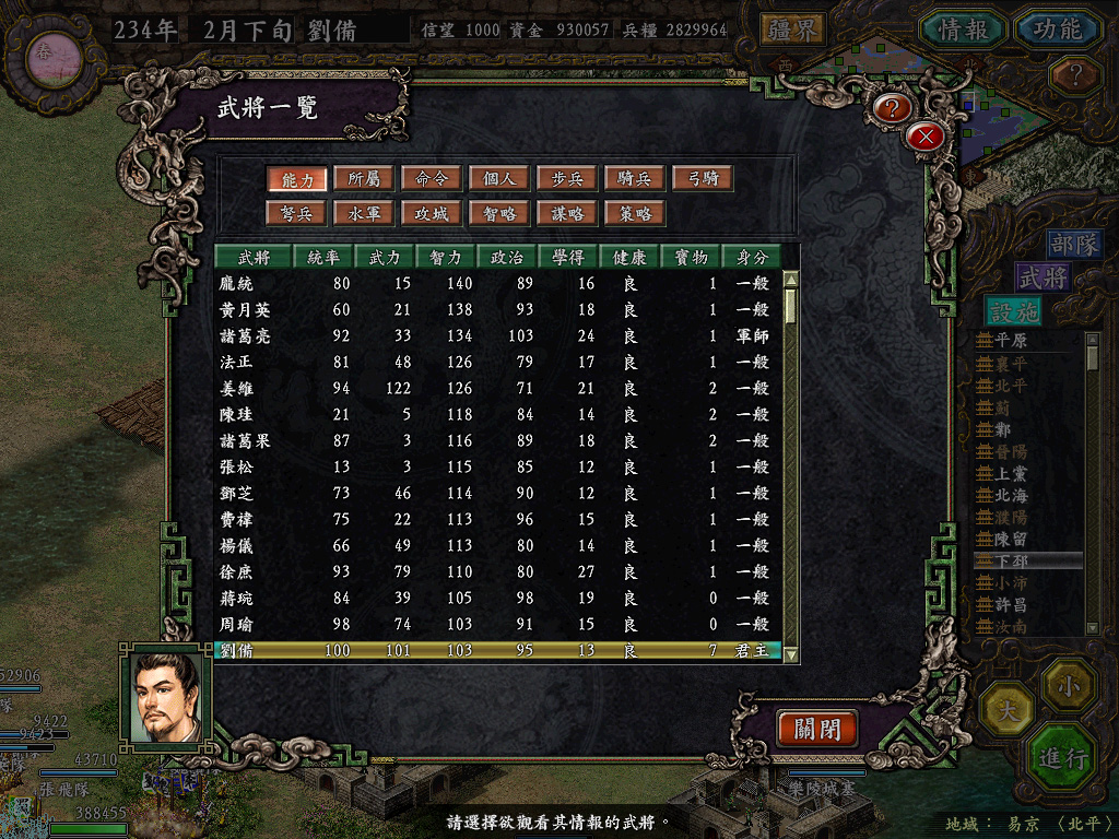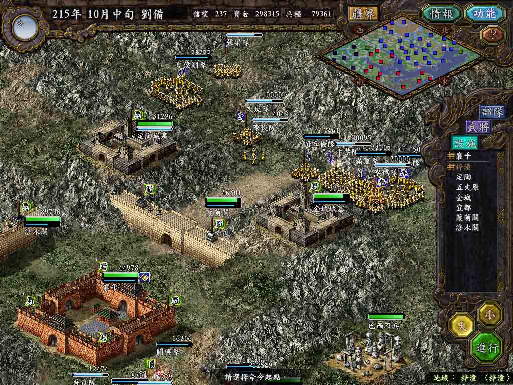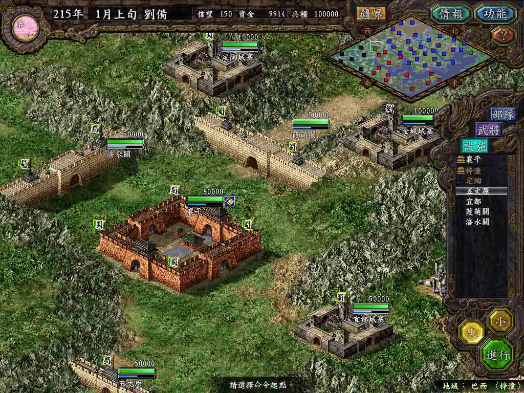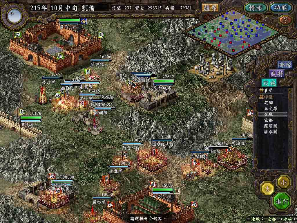 刘备:入川受挫,转而攻下襄平(原梓潼),兵力30万. 虽强敌四顾但西有涪水关拒刘焉, 北有剑阁天险拒曹操, 东面宜都城塞和五丈原关隘互为犄角对抗东吴(但刘焉占据金城城塞), 手下猛将如云(87员将领), 除了一些蜀将, 几乎所有和刘备沾亲带故的都来帮忙了, 尤其是家园被刘焉所灭, 愤而投奔刘备的祝融一家. 且四方人民闻听皇叔有难, 纷纷进献宝物, 以助皇叔得脱此难.