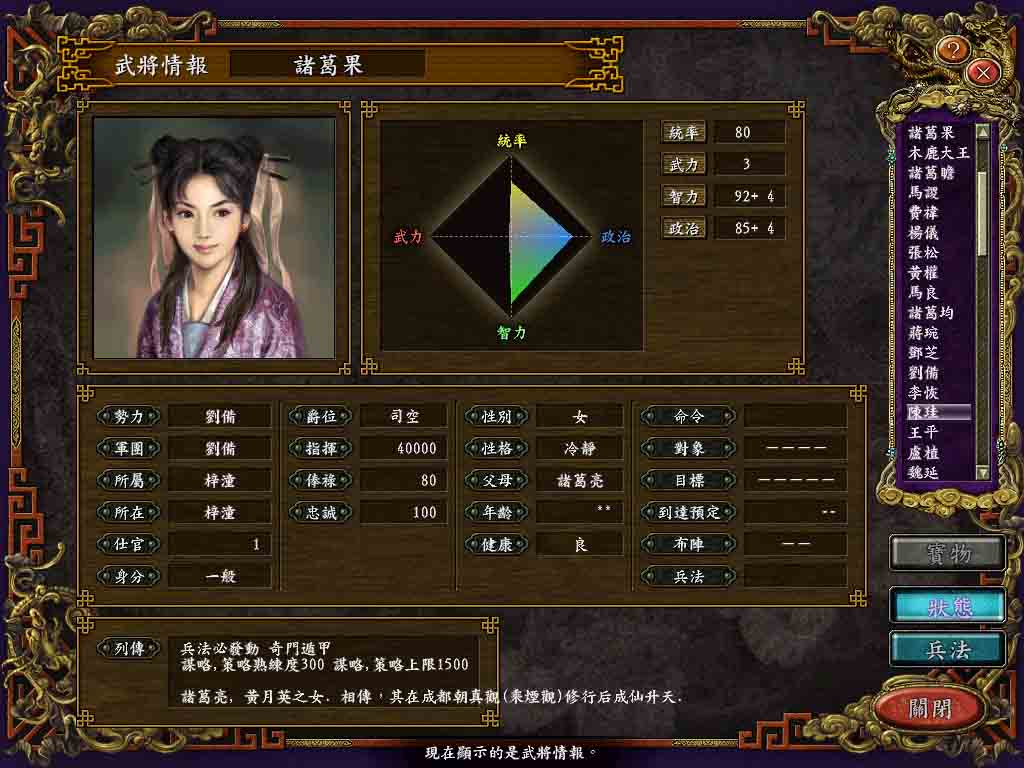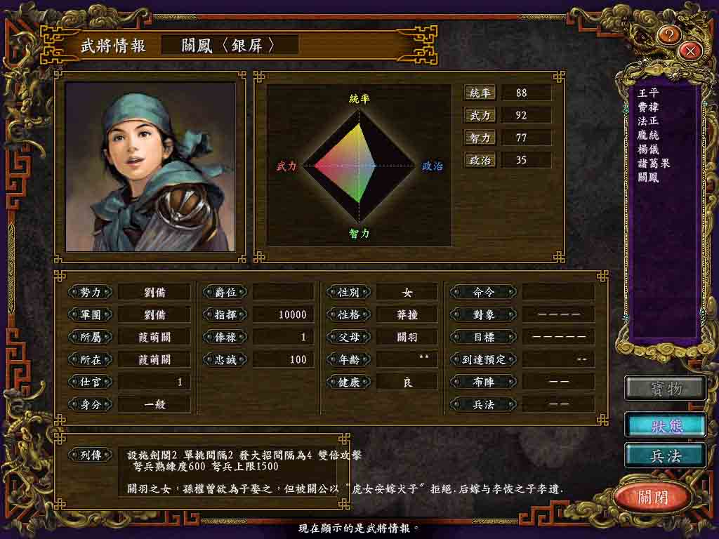 加魏猛和黄叙主要是考虑到魏家军和黄家军实在是人丁单薄, 而关凤是因为她是魔兽同名地图<守卫剑阁>里面第一女汉子, 而在san9居然完全没登场太说不过去. 诸葛果是小字辈中唯一一个会奇门遁甲的, 没办法,人家是半仙阿. (本来还想加严颜的儿子严寿, 祝融孟获的女儿花蔓, 但考虑到刘家军再加人就bug了, 就先算了)
