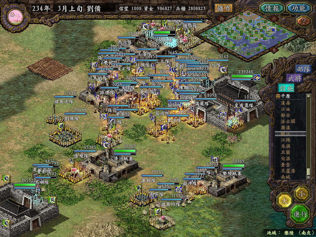 地图总兵力已经几乎达到电脑能够忍受的上限, 因为再增加兵力电脑开始进入秀逗状态(不出兵了). 而且因为总兵力大于总城市人口,所以在第一年内是没有兵役的, 不过反正电脑会源源不断的送兵来, 而且玩家在金城有贼归顺事件.