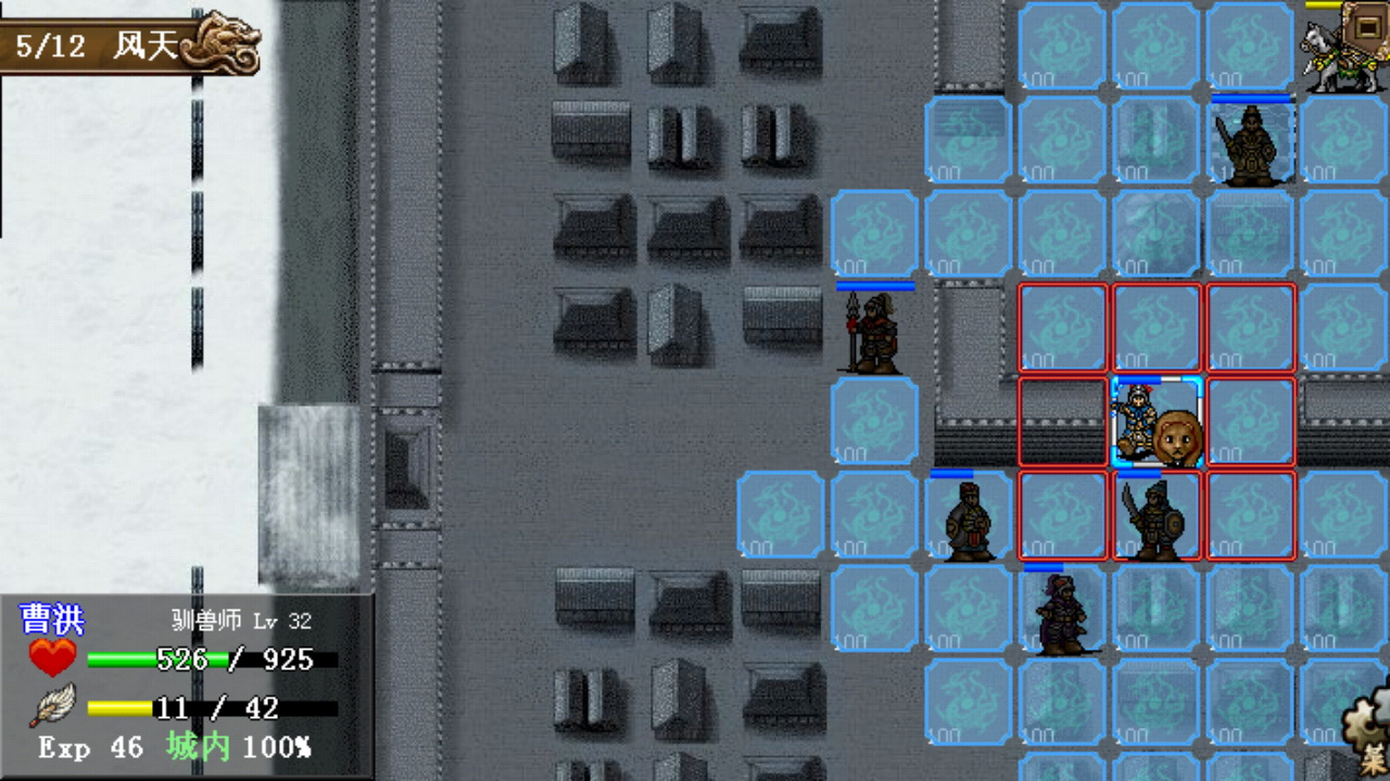 另外这里有必要说说爪机版AI一些特性,因为AI行动策略相对PC版的一些改变也给这一关增加了不少难度,爪机版相对PC版的攻击性相对较强一些,AI攻击目标的选择考虑的不再是伤害占HP总量比例的高低,而是绝对的伤害量,除去一击必杀的情况,敌军会优先选择能造成最大伤害的我军武将执行攻击,像曹洪这种防御不高的武将已经不能再凭借高HP量避开敌军的仇恨了;另外,拥有策略攻击能力的敌军使用策略攻击的偏好更高,即使物理攻击能对我军武将造成更大的伤害,像山贼、海贼迎面而上放火放水的事件屡见不鲜,宛城外面会落石的山贼因此成为了心腹大患,幸好他们还没有学会放火TT;敌军在自身残血时也更加的理智,AI在判断自己攻击敌军可能会被反击致死时会改变原有的攻击策略,攻击无反击确保自身的生存成为首选的攻击策略,所以一些具有远距离攻击或者策略攻击能力的敌军最后往往要通过我军武将的主动攻击来收割人头,本来能反击杀死的残血敌军只能采取主动攻击的方式杀死,这样也造成了一定的行动力浪费……