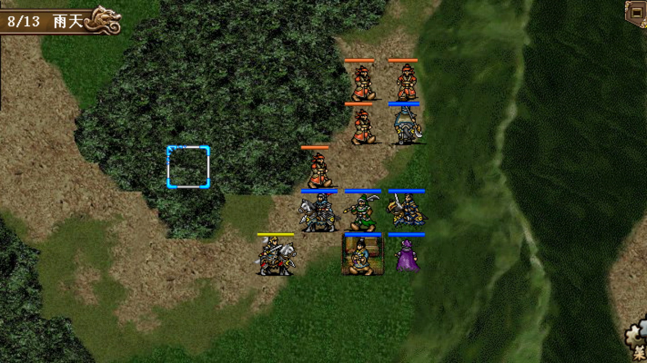 这一关挺麻烦的,手机版敌军的伏兵第3回合就出来了,开局无法再到达河边布阵了,只能围着村庄来打,曹操、大小夏侯在外面,其余的武将往右上山或入树林,利用好优势地形。李典深入树林算好位置第一时间触发和李傕的单挑破其防御,敌军左右两侧都有弓兵,十分恶心,应该找机会优先干掉,对付高防的西凉骑徐荣没有太多的好办法,只能让曹操大小夏侯在和他刚正面,慢慢消耗。如果前期能合理布阵提高杀敌效率,熬到吕布出击反倒没有什么压力了,吕布的ai攻击锁定曹操,曹操站在村庄让他打,利用旋风和远距围攻,绝影夏侯渊过河拿物品,17回合全灭过关。