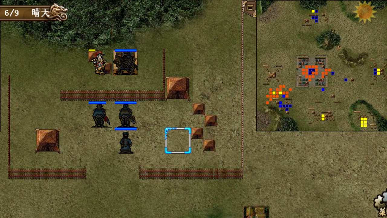 这一关的思路是合兵,曹操、曹洪、典韦逃出大营在敌军大营西侧的河畔和援军会师后再合力反推,这样可以充分利用荀攸的光环和法术补给,解放全队的战斗力。开局如下第二回合图所示,曹操三人逃到大营南门口,曹操曹洪站在门口的上方,曹操给自己加速,典韦绝影打完胡车儿之后跑到左边的民居确保不要被胡车儿攻击到,三人注意不要越过栅栏那条线,否则外面的敌军会主动出击围住曹操三人,那样的话整个逃跑计划也就泡汤了,敌方回合依靠洪神的反弹可以对双戟胡车儿造成不小的伤害,这是快速消灭胡车儿夺回典韦的武器重要的一步;第二回合援军过河徐晃堵住大营的西门,夏侯惇吸引下面的武术家和贼兵上来攻击,曹操往左边武术家和贼兵的方面移动卡位,典韦攻击左边的贼兵后再往回跑卡住张绣胡车儿的追兵,曹洪先龟缩在曹操和典韦中间,避免诱发左边的贼兵和武术家的攻击;接下来曹操可进一步西进卡住武术家往下方和右方移动的线路,并对典韦进行补给,在消灭作为合兵障碍的武术家和贼兵之前,典韦还是要继续卡位挡住右边追击的敌军,洪神攻防乏力而且曹操也无力再对其进行补给,因为要达成三光的目标,也不能自行吃药,所以还是暂时先往下方走避开敌军的攻击范围求自保就行了;大概第4回合消灭了贼兵和武术家之后,就能合并一处,扎堆防御和补给了,这时候就没有什么难度了,稳打稳扎,先杀死胡车儿夺回武器,适当利用曹洪反弹敌军的远程,慢慢开始反推,最终14回合全灭过关。