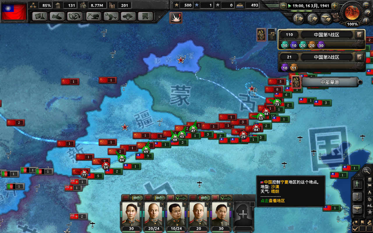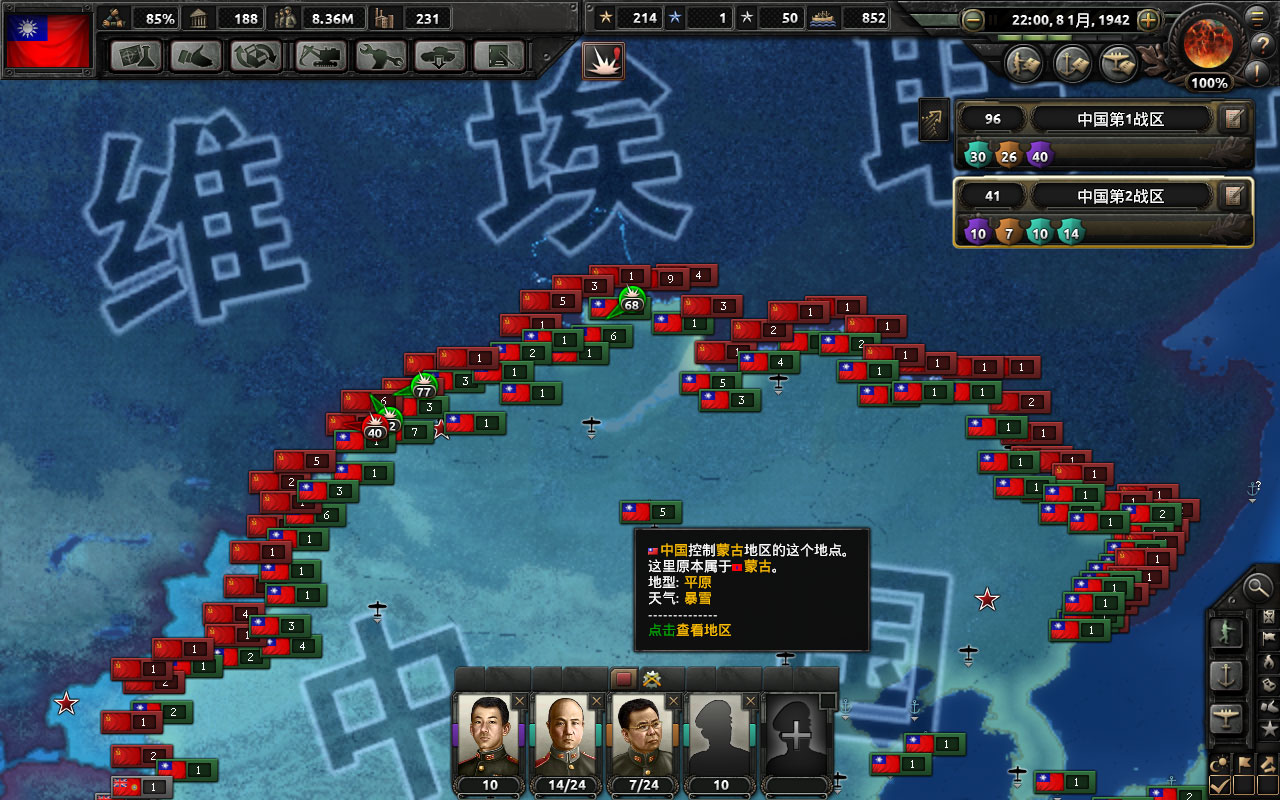 国军总共110个师,守备师10个,伞兵师10个.5步4炮王牌步兵师30个.刚扩编过的14步3炮3反坦大编制步兵师10个.7步2炮标准步兵师50个