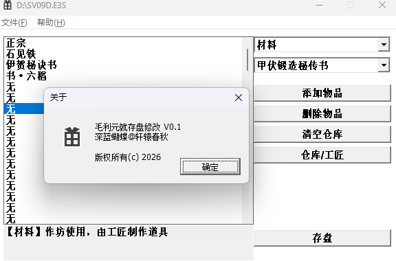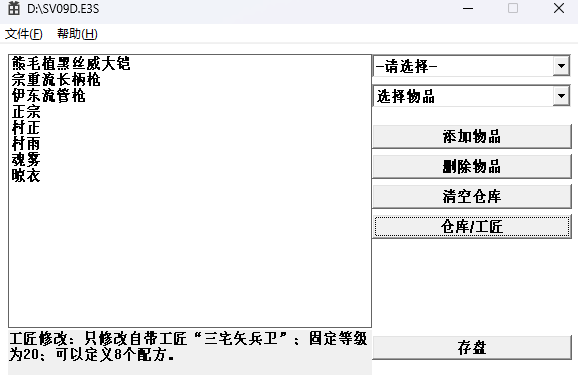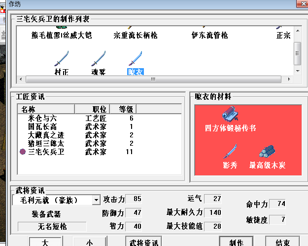 英杰传系列,个人感觉《毛利元就》是最经典一款。训练场系统、工匠系统都是后来系列不具备的。网上的修改器大多只是改了装备。最近重温这个游戏,自己用VC写了一个存盘修改器。可以往仓库添加道具和材料,还支持初始工匠(三宅矢兵卫)的8个配方的修改。